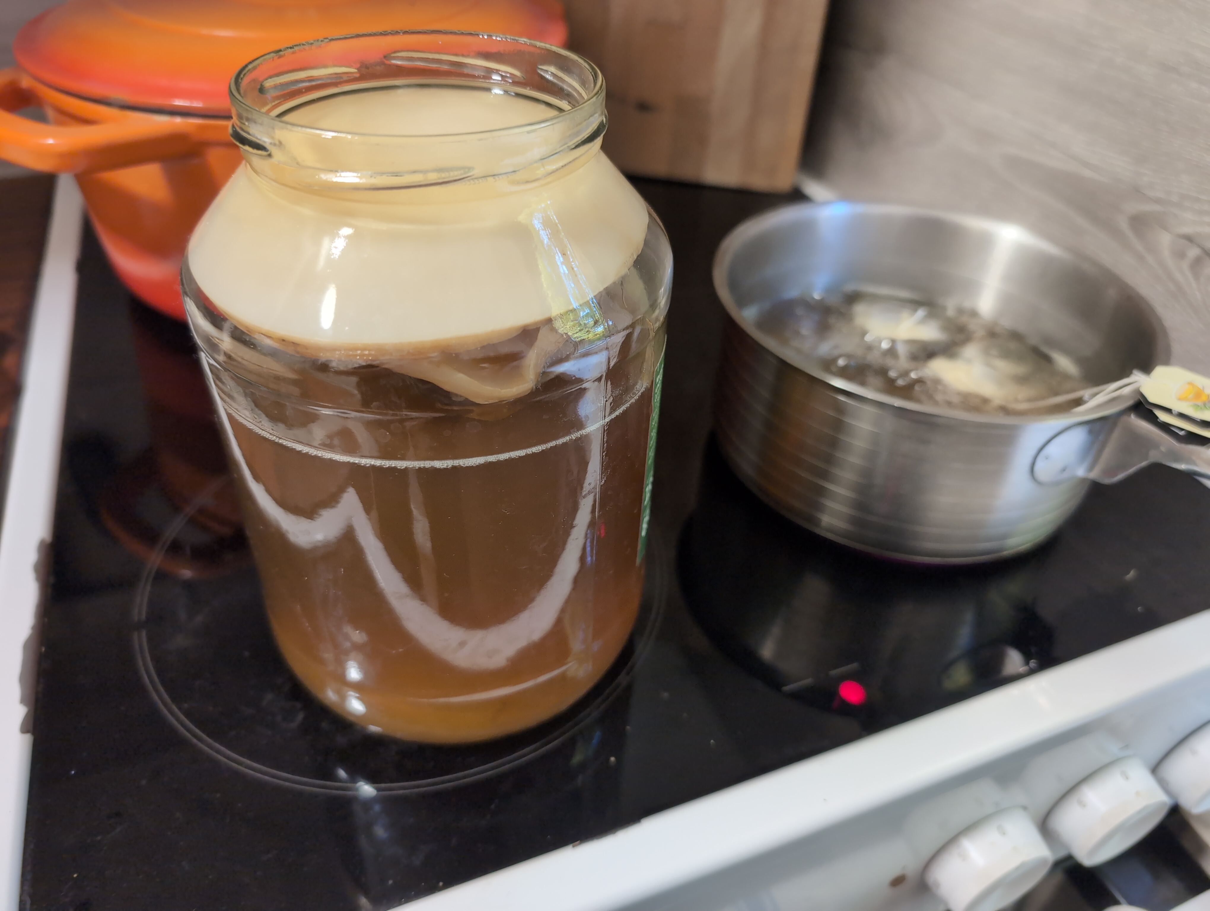 >>1692 >>1667 Its Kombutcha. The white thing is a Scoby (mushroom-bactaria thing)